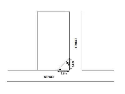 - You cannot build within the site triangle if you live on a corner (7.5 metres from the corner of the lot, in either direction, and creating a triangle by joining those two lines) or any fence greater than 0.75 metres in height which will obstruct the vision of drivers.