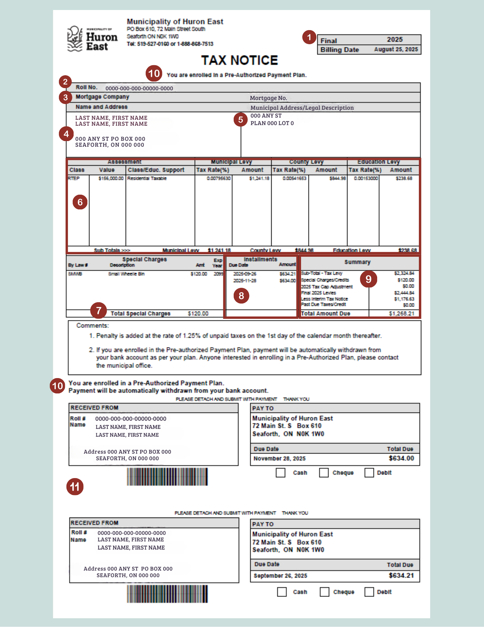 The Municipality of Huron East issues two (2) tax bills annually. Each billing is split into two installment due dates.