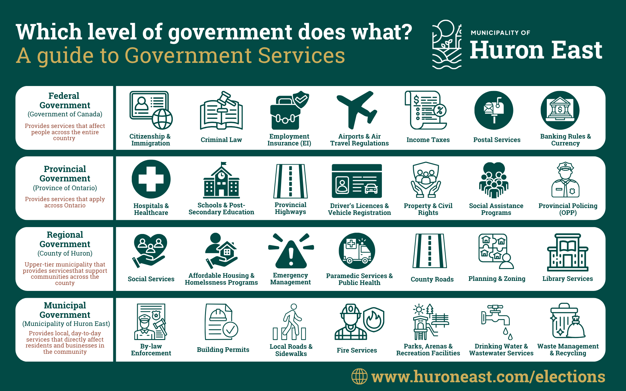 The next municipal election will be held on Monday, October 26, 2026, at which time Huron East voters will elect the following offices: